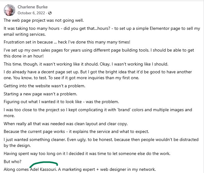 ” I added him as a friend on Facebook. I am a young graphic designer but only had shallow knowledge as far as my target market is concerned and what specific services to offer. So, after an hour or so with Adel, I now have a clear message/USP (unique sale proposition), and I know whom to offer my services to. and what exact service to provide. It’s such an honor with great privilege knowing Adel because he has really left a great impact on me.”